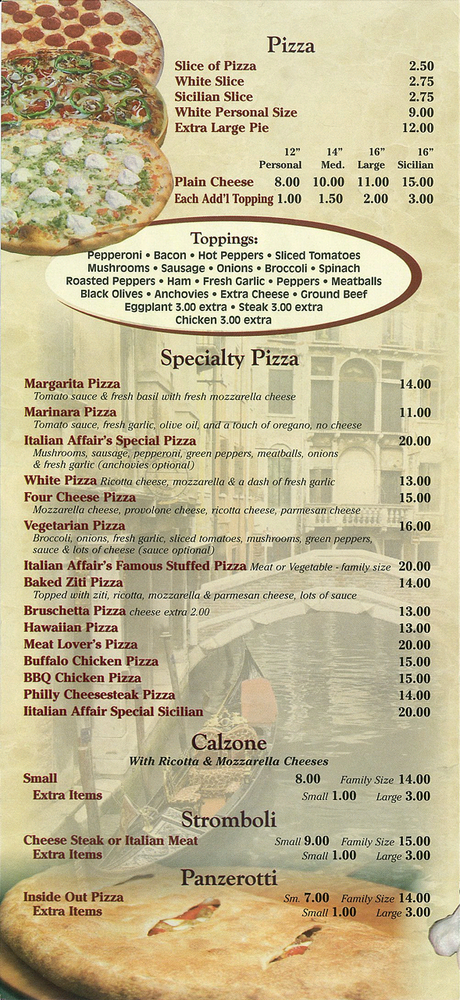 With options for takeout, delivery, and even catering, Italian Affair brings the taste of Italy right to your doorstep. Whether you're dining in or grabbing a quick slice, your taste buds are in for an unforgettable affair!